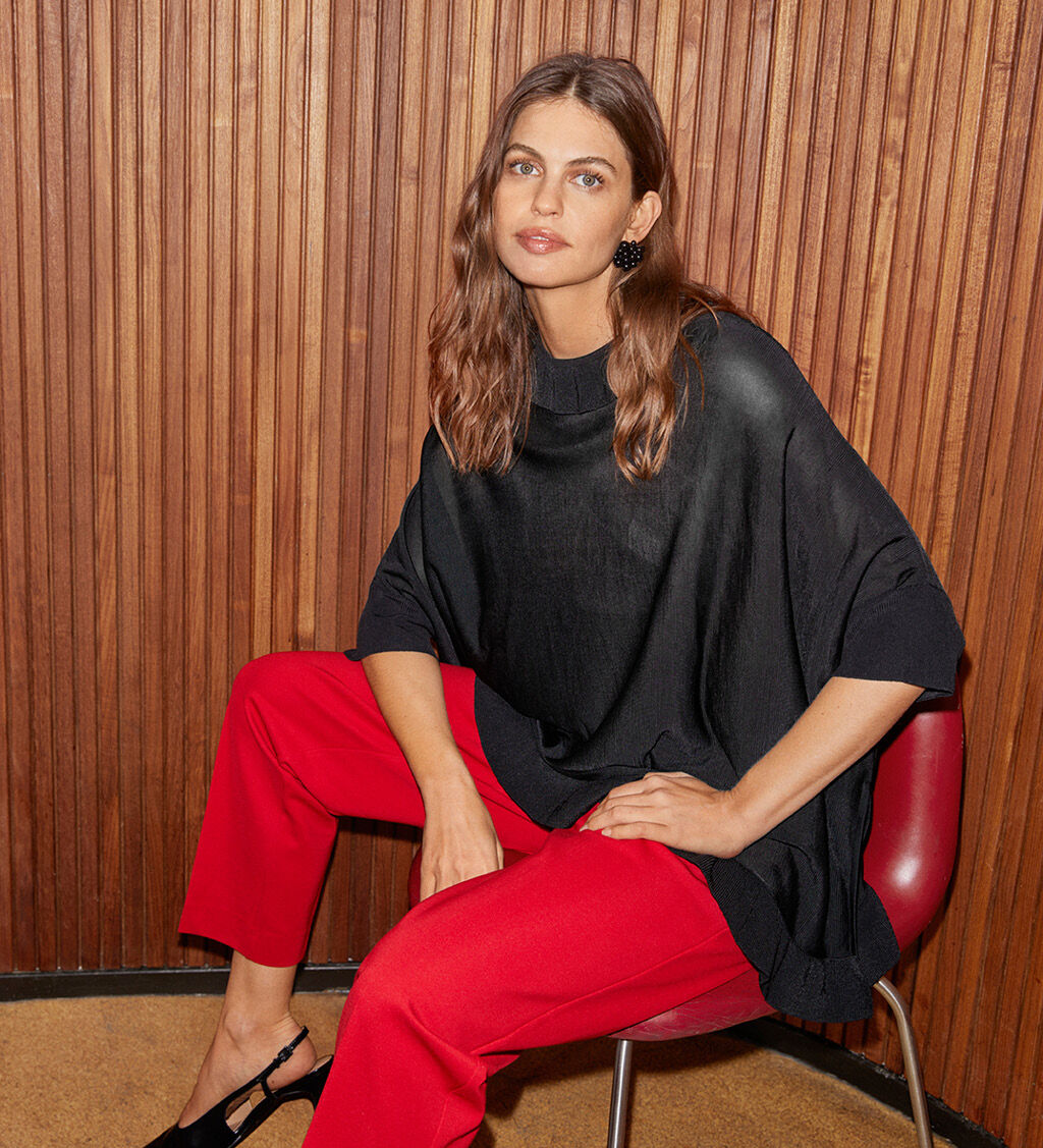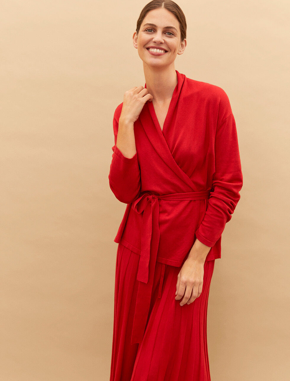 If you only need to update your wardrobe with one item, let it be this beautiful red cardigan with a wrap effect, designed in our popular and buttery soft viscose knit. Style it with the skirt in the same soft knit fabric for a comfortable and elegant look.
